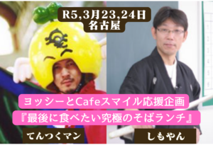 ヨッシーとCafeスマイルの応援企画! てんつくマン&しもやん参戦! 3月23、24日 発明王⭐️てんつくマンとしもやんが名古屋に向かいます。 向かう場所はCafeスマイル。 仮装が大好きでア […]