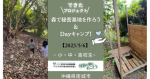 木材、廃材など身近にあるもので創造力をふくらませて自分だけの秘密基地を作ってみよう! ■イベント概要 ①場所 集合:南城市佐敷手登根119-3活動場所(森):南城市佐敷手登根153 ② 開催日時 2023年5月6日8:3 […]